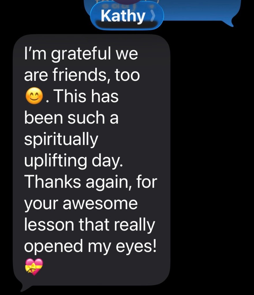 Wow. So kind. I don’t even know what I said or what Kathy was talking about in my lesson that helped her, but that was exactly my intention- that she would be taught by the spirit, that God would speak to her and help her.